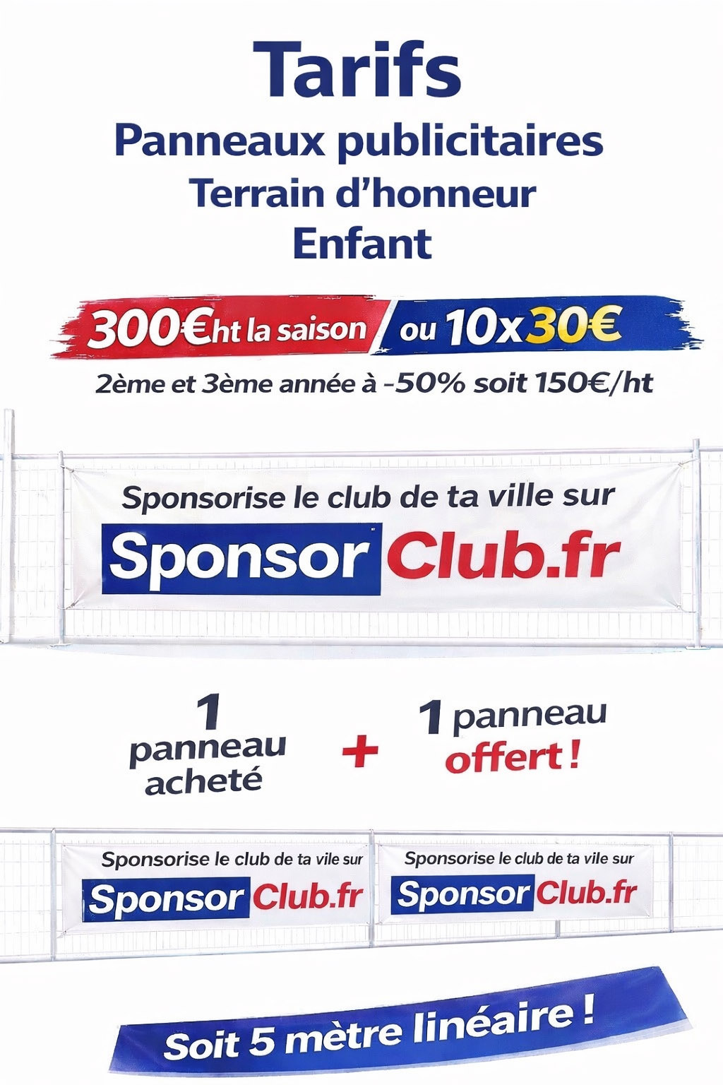 Pour toute souscription, un panneau publicitaire est offert pour un panneau acheté, vous permettant de bénéficier de 5 mètres linéaires de publicité autour du terrain pendant toute la saison sportive.
